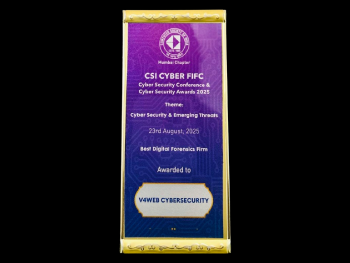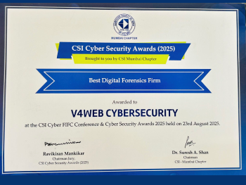We at V4WEB CYBERSECURITY are honoured to receive the award for "Best Digital Forensics Firm" from the CSI Mumbai Chapter at their flagship event – CSI Cyber Fraud, Forensics and Investigations. Over the past few years, our team has been privileged to crack some of the most complex investigations and provide incident response support to several large national and international organisations impacted by Data breaches, Ransomware attacks, Business Email Compromise scams, Corporate Identity Theft & Brand Abuse, Insider threat cases, Corporate Espionage, Disinformation & Misinformation Campaigns and much more.